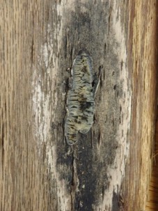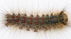 Spongy moth is a non-native invasive insect. Spongy moth defoliates trees and over time can cause those trees to die. Caterpillars chew holes in the leaves, and if there are high population levels of LDD moth they can strip tree canopies. The caterpillars of LDD moth selectively attack oak trees, among others, which happen to be especially sensitive to the risks of defoliation. The caterpillars are 5-6 cm long with five pairs of blue dots and six pairs of bright red dots along their back. The female moths are white with dark markings. There are four life stages of development: Egg, caterpillar, pupa and moth.